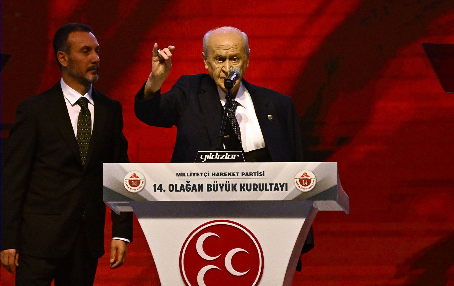 Kurultay'da konuşan Bahçeli, Erdoğan'a seslendi. "Ayrılamazsın" diyen Bahçeli, "Türk Milletini yalnız bırakamazsın. Bunun için Cumhur İttifakı olarak yanındayız. Yeni yüzyılın kurtarıcı lideri olarak sizleri görmek istiyoruz" ifadelerini kullandı.