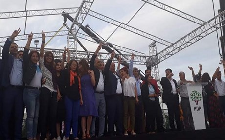 “Yine bir Haziran günü size buradan seslenen Demirtaş'a zılgıtlatla halaylarla selam gönderiyoruz. 24 Haziran sadece bir seçim değildir. Üç yıldır bize, devrimcilere saldıran AKP-MHP faşist koalisyonundan hesap sorma günüdür. Bitmedi, Sur'un, Cizre'nin, Kerkük, Kobani'nin hesabını sorma vaktidir. Erdoğan bizi baraj altında bırakacakmış. Bunun cevabını 24 Haziran'da vereceğiz. Bir oyumuz Demirtaş'a, bir oyumuz HDP'ye. Erdoğan'ı Saray'dan indirdiğimiz gün bayram günüdür.”