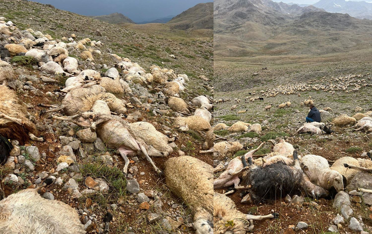 200 koyununun yıldırım düşmesi sonucu telef olduğunu söyleyen Mürsel Bulut, "Bu dağlarda zor şartlarda üretim yaparak geçimimizi sağlıyorduk. Yıldırım düştü ve 200 koyunum telef oldu. Benim 2 yıllık emeğim gitti. Mağdurum. Lütfen bana yardım edin" dedi.