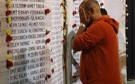 Kentte depremde yıkılan bazı binaların enkazı üzerine kurulan Deprem Anıtı'na akşam saatlerinde gelen vatandaşlar, felakette yaşamını yitirenlerin isimlerinin yazılı olduğu beton bloklara çiçek bıraktı.