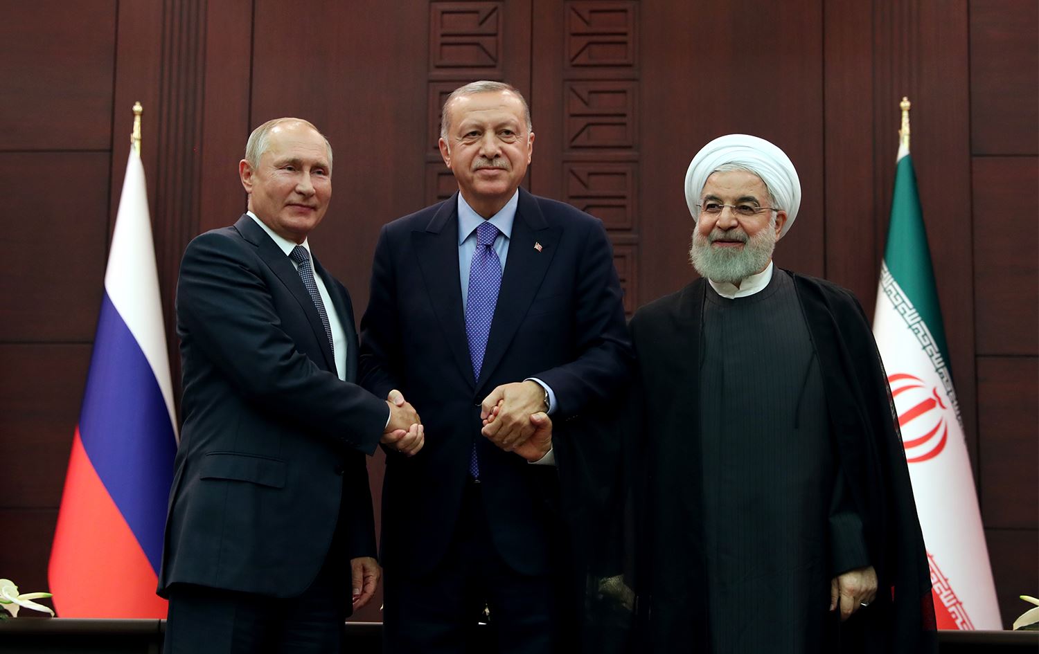 Haber Merkezi - Türkiye Cumhurbaşkanı Recep Tayyip Erdoğan, Rusya Devlet Başkanı Vladimir Putin ve İran Cumhurbaşkanı Hasan Ruhani, Çankaya Köşkü'nde gerçekleştirdikleri "Suriye" konulu Türkiye-Rusya-İran Üçlü Zirvesi sonrasında ortak basın toplantısı düzenledi.