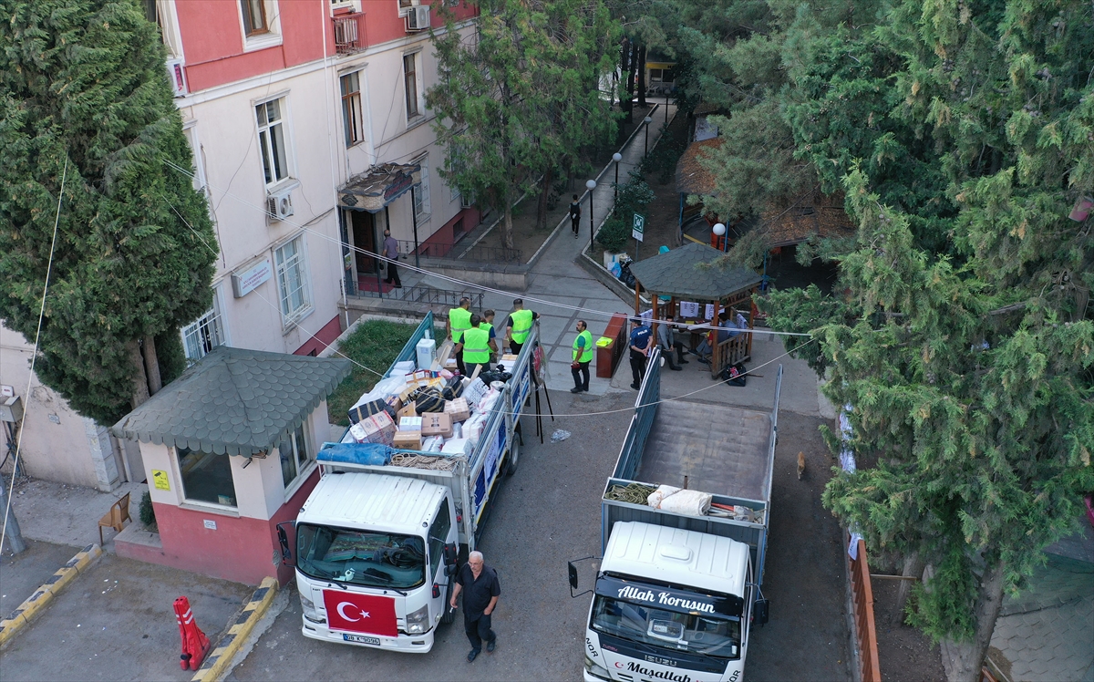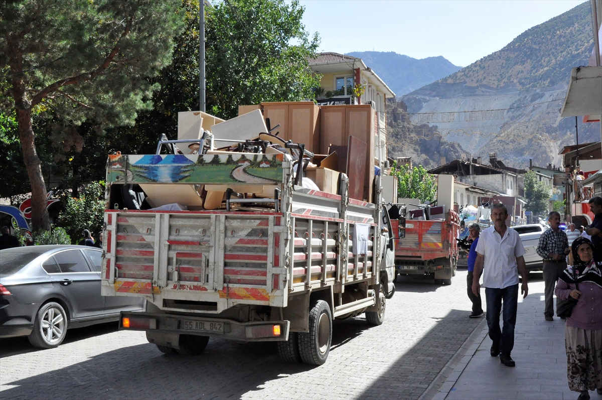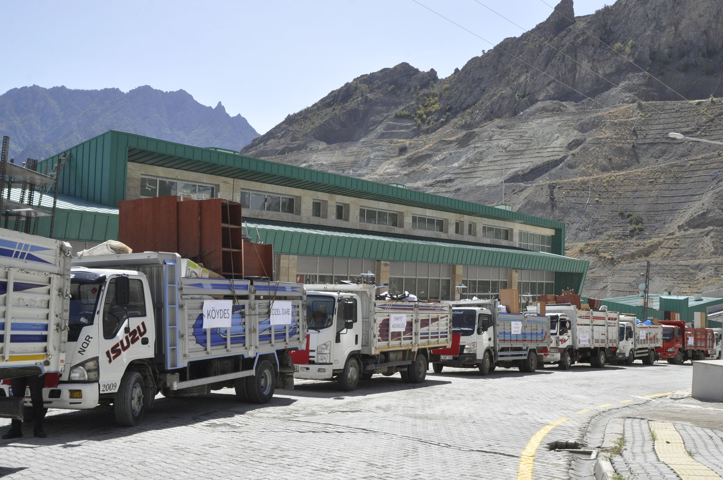 Binalardan çıkarılan masa, sandalye, dolap ve diğer eşyalar, işçiler tarafından kamyonlara yüklenip, yeni hizmet binalarına yerleştiriliyor.