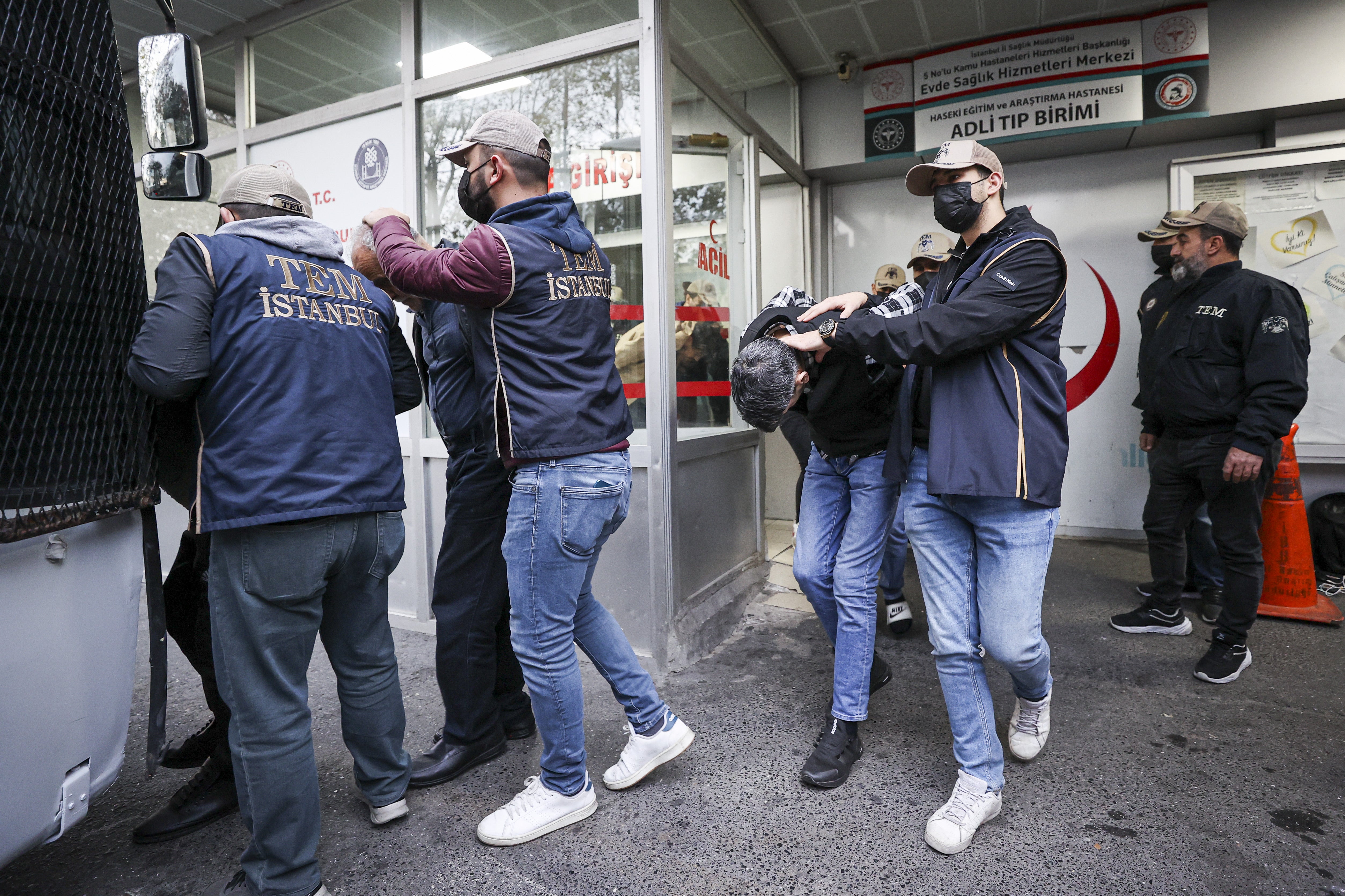 İstanbul Emniyet Müdürlüğünün Vatan Caddesi'ndeki yerleşkesinde 4 polis minibüsüne bindirilen 49 zanlı, zırhlı araçlar eşliğinde götürüldükleri hastanelerde sağlık kontrolünden geçirildi.