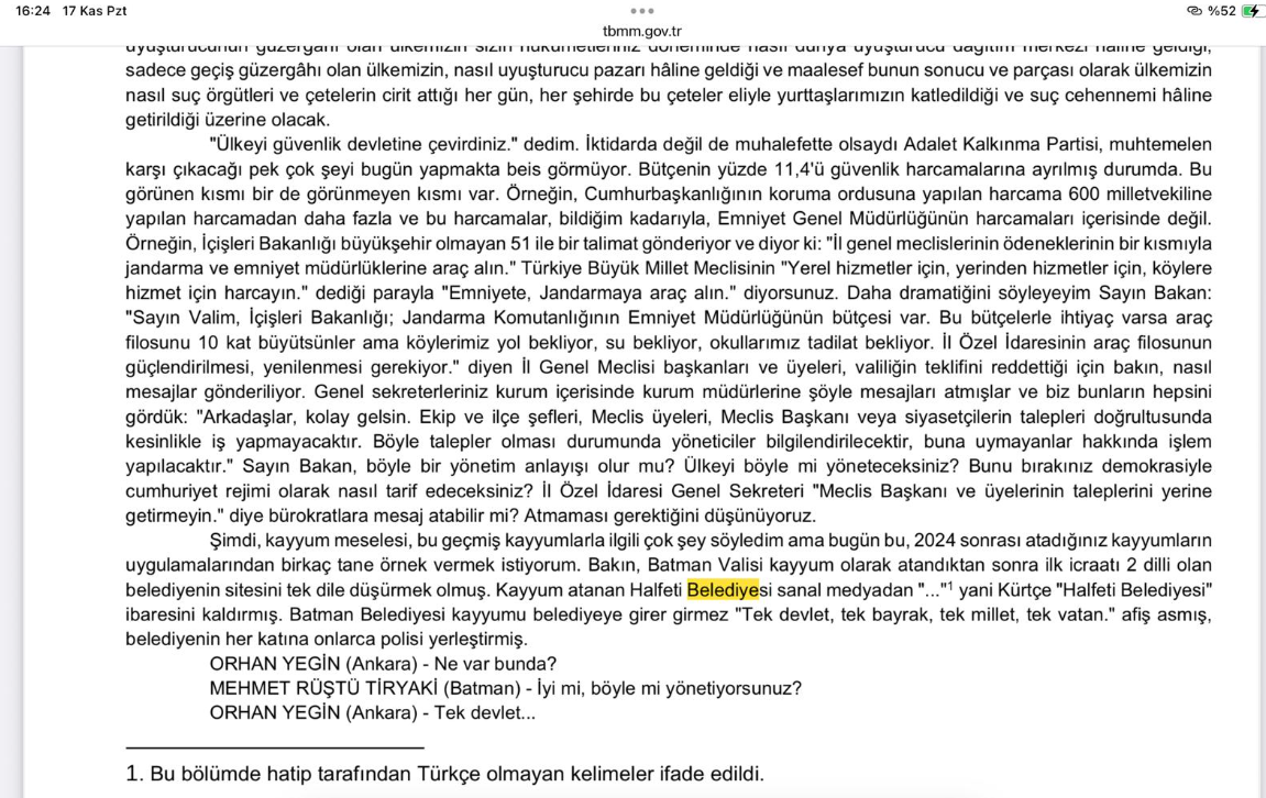 Kürtçe ifadeler yerine tırnak içinde 3 nokta işareti kullanılırken sayfa sonunda “Bu bölümde hatip tarafından Türkçe olmayan kelimeler ifade edildi” notu yer aldı.