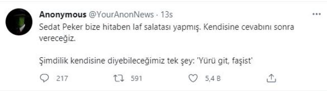 Anonymous tarafından ise kendilerine yanıt veren Peker'e ilişkin Twitter hesabı üzerinden şu ifadeler paylaşıldı: