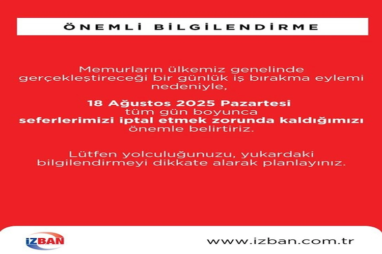 Memur-Sen ve Türkiye Kamu-Sen'in çağrısıyla gerçekleştirilen eylem nedeniyle, İzmir Banliyö Sistemi (İZBAN) 18 Ağustos 2025 Pazartesi günü tüm tren seferlerini iptal etmek zorunda kaldı. İZBAN, sosyal medya üzerinden yaptığı açıklamada, "Memurların ülkemiz genelinde gerçekleştireceği bir günlük iş bırakma eylemi nedeniyle, 18 Ağustos 2025 Pazartesi tüm gün boyunca seferlerimizi iptal etmek zorunda kaldığımızı önemle belirtiriz" ifadelerini kullanarak yolcuların alternatif ulaşım planları yapması çağrısında bulundu.