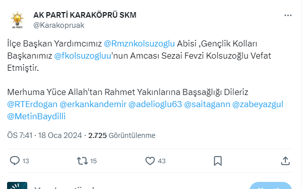 Kolsuzoğlu'nun vefatına ilişkin AK Parti Karaköprü İlçe Başkanlığı'nın resmi X hesabından başsağlığı mesajı yayınlandı.