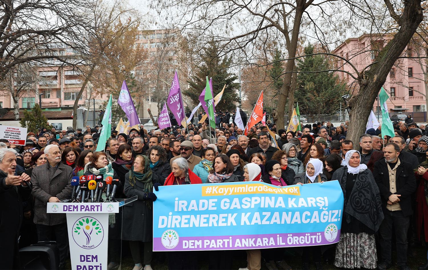 Halkların Eşitlik ve Demokrasi Partisi (DEM Parti) Eş Genel Başkanları Tülay Hatimoğulları ve Tuncer Bakırhan, partinin tüm belediye eş başkanları, belediye meclis üyelerinin aralarında olduğu çok sayıda kişi kayyımları protesto etmek için Ankara’daki Güven Park’ta açıklama yaptı.
