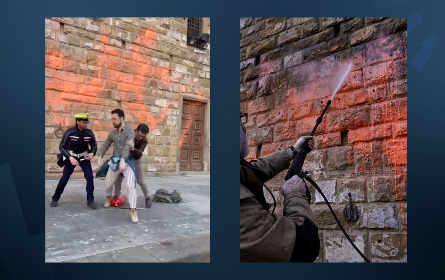 İki iklim aktivisti, öğle saatlerinde Vecchio Sarayı'na gelerek binanın duvarına yangın tüplerine doldurulmuş turuncu boyayı sıktı.
