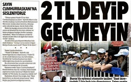 "Dünya Şokta! Yüzde 52 oy alan Cumhurbaşkanı'na idam kararı" diyerek Mısır'ın bir önceki Cumhurbaşkanı Muhammed Mursi hakkında verilen idam cezasını şoke edecek bir karar olarak ifade ettik.Bizim bu başlığı atmamızdan 2 saat sonra siz İstanbul'da kürsüye çıktınız ve bizim attığımız başlığın birebir aynısını söylediniz. ‘Mısır'da halkın yüzde 52 oyuyla seçilen Mursi ile ilgili idam kararı verildi’ dediniz. Ancak ertesi gün Kayseri meydanında şöyle dediniz: ‘Türkiye'de medya grubu nasıl verdi? Yüzde 52 ile idam!’. Sayın Cumhurbaşkanı, ‘Yüzde 52 ile idam’ diyerek, sizi kastettiğimizi ima ediyorsunuz. Yüzde 52 ya da yüzde 52 bilmem kaç hiç farketmez. Seçilmiş bir Cumhurbaşkanı'nın idam edileceğini ima etmek şerefsizliktir.