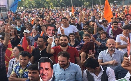 Mitinge katılanlar, ellerinde partilerinin tutuklu cumhurbaşkanı adayı Selahattin Demirtaş'ın fotoğraflarını taşıdı.