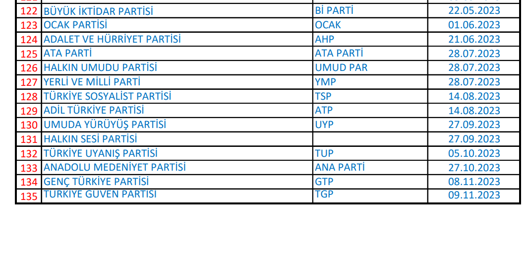 “Büyük İktidar Partisi (Bİ Parti), Ocak Partisi (Ocak), Adalet ve Hürriyet Partisi (AHP), Ata Parti,