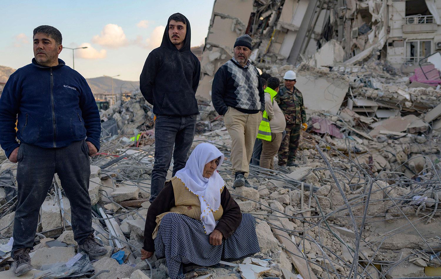 19 Şubat 2023'te Hatay'da çöken binanın enkazından yakınlarının çıkarılmasını bekleyen bir kadın. / (Fotoğraf: Yasin AKGÜL / AFP)