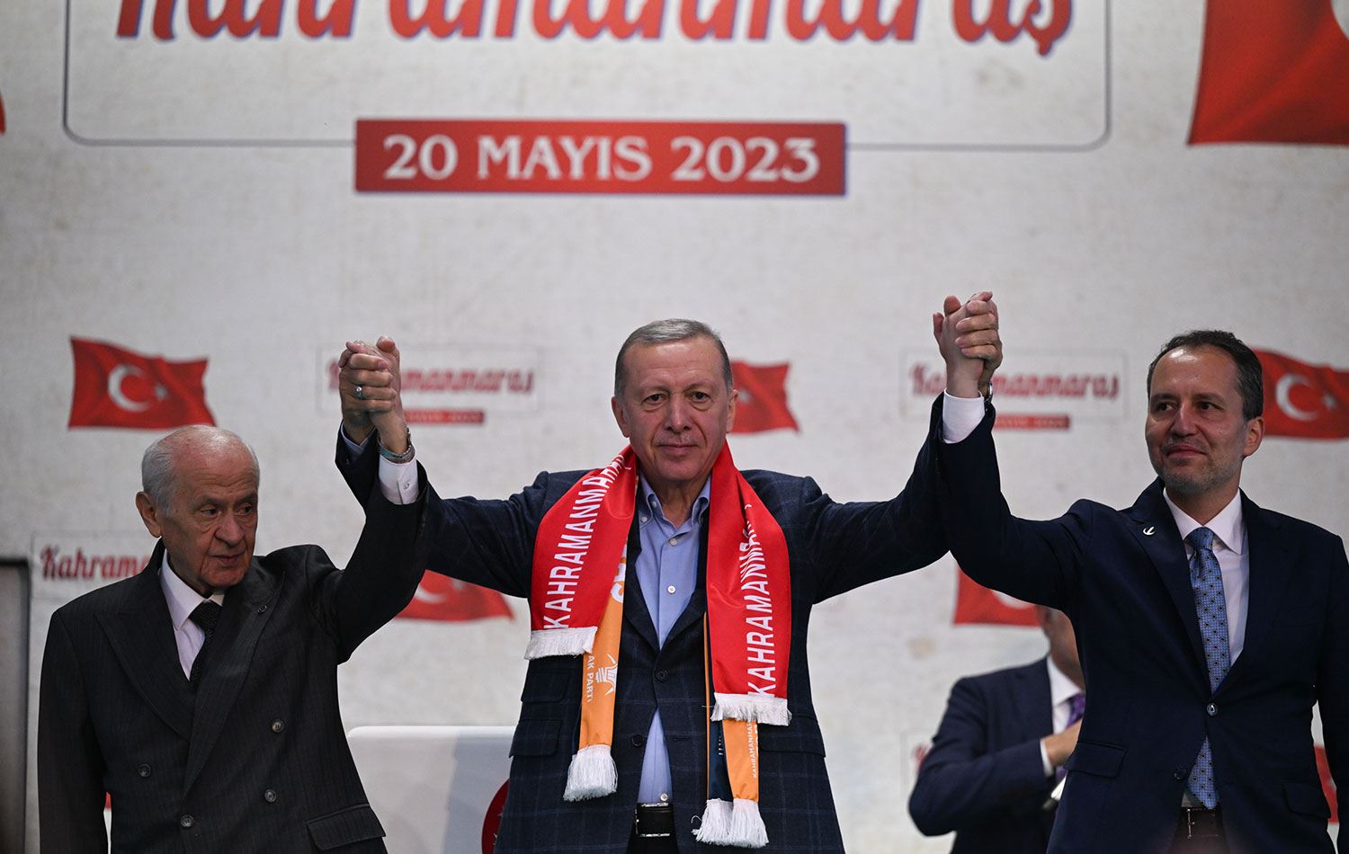 Erdoğan, Maraş’ta MHP Genel Başkanı Devlet Bahçeli ve Yeniden Refah Partisi Genel Başkanı Fatih Erbakan ile vatandaşları selamladı. / AA