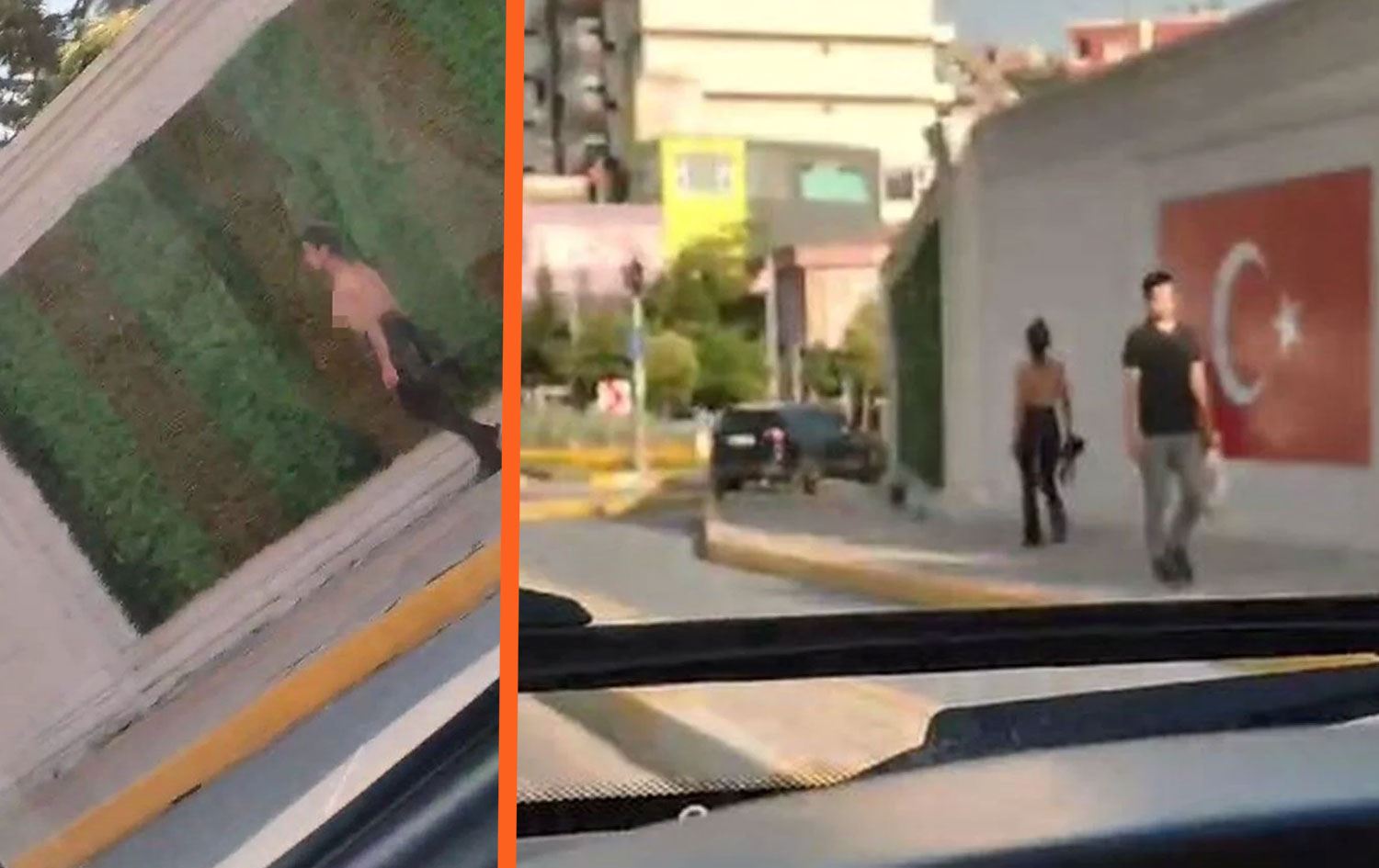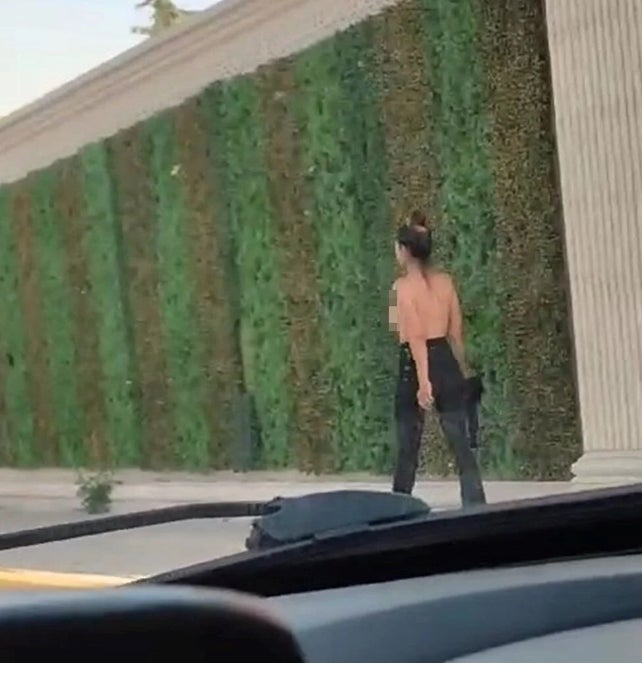 Kadının üstsüz yürüdüğü anlar, trafikteki bir kişi tarafından cep telefonuyla kayda alındı.