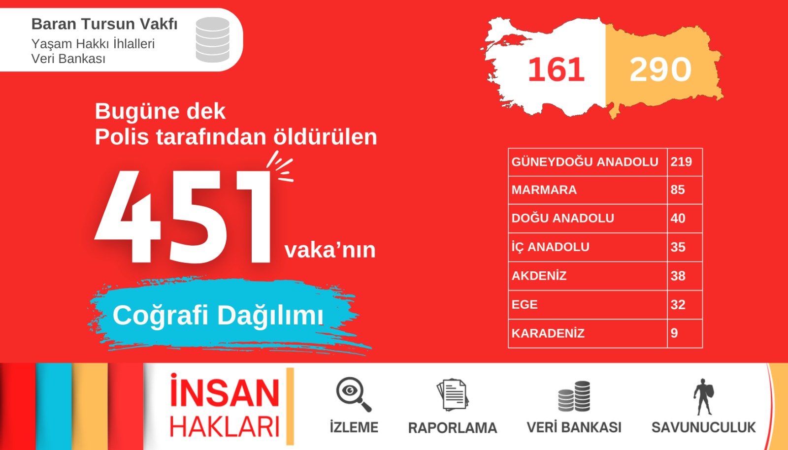 Bölgelere göre polislerden kaynaklı ölüm dağılımı ise Güneydoğu Anadolu'da 219, Marmara 85, Doğu Anadolu 40, Akdeniz 38, İç Anadolu 35, Ege 32 ve Karadeniz 9 kişi olarak kaydedildi.