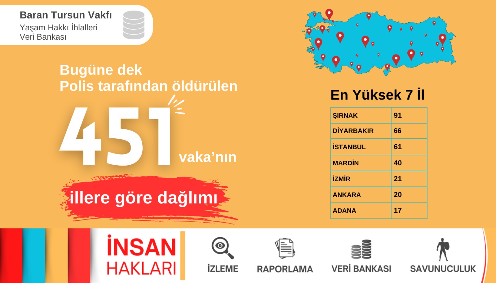 Polislerden kaynaklı en çok ölüm 91 kişiyle Şırnak gelirken, Diyarbakır'da 66, İstanbul 61, Mardin 40, İzmir 21, Ankara 20 ve Adana 17 olarak kayıtlara geçti.