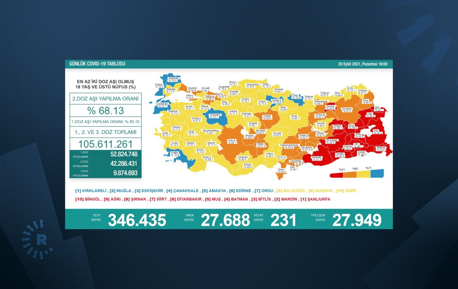 GÜNLÜK COVİD-19 TABLOMUZ DEĞİŞTİ. Bugünden itibaren, il bazında, ilk doz yerine, en az iki doz aşı olanların oranlarını paylaşacağız. Aşılarımızı yaptırarak vaka sayılarını düşürelim, can kayıplarımızı azaltalım. İlk doz aşıda önemli bir mesafe kaydettik. pic.twitter.com/gsSO98Hdck