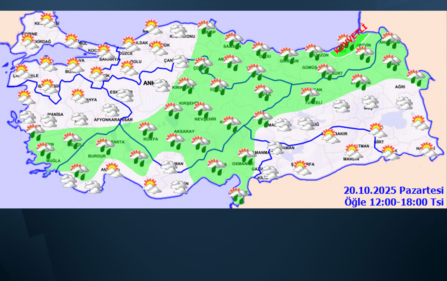 Meteoroloji, 20 Ekim hava durumu raporunu yayımladı. 6 il için sarı kodlu uyarı yapılırken; Denizli, İzmir, Muğla, Adana, Antalya, Hatay, Isparta, Ankara, Çankırı, Konya, Bolu, Sinop, Amasya, Rize, Samsun, Trabzon, Erzurum ve Kars'ta sağanak bekleniyor. Hava sıcaklıklarının, kuzey ve iç kesimlerde azalacağı tahmin ediliyor.