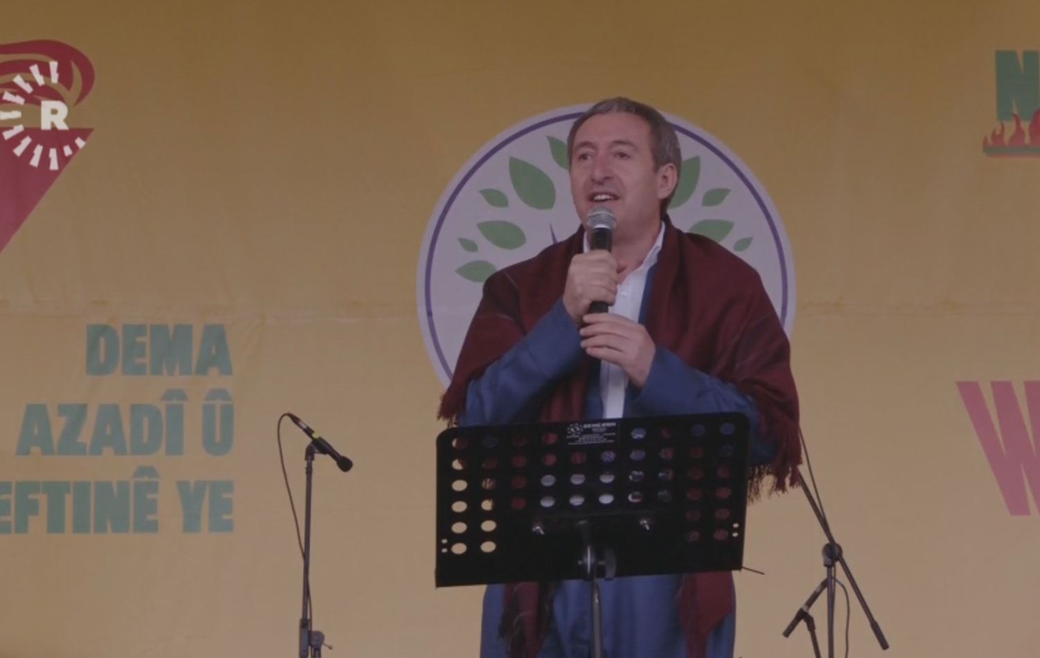 Tuncer Bakırhan “Rabe, dema azadî û serkeftinê ye” (Ayağa kalk, şimdi özgürlük ve zafer zamanı) sloganı ile gerçekleştirilen Newroz kutlamasında konuştu.