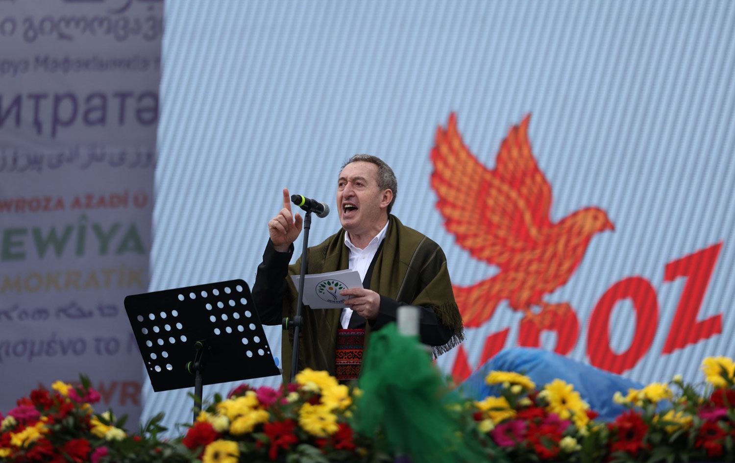 Değerli halkımız bu meydanda sizlerin huzurunda milyonların şahitliğinde tarihi bir taleplerimizi çok bir net bir şekilde ifade etmeye çalışacağım. Hani hep soruyorlar ya Kürtler ne istiyor diye. Bugün 2026 Newrozu’nda Amed Meydanı'nda Kürtlerin ne istediğini bir kez daha, hep birlikte tekrar edelim. Kürtler Türkiye'de kimliğinin tanınmasını istiyor. Kürtler ana dilinde eğitim istiyor. Kürtler anayasal güvence istiyor. Kürtler yerel demokrasi istiyor.