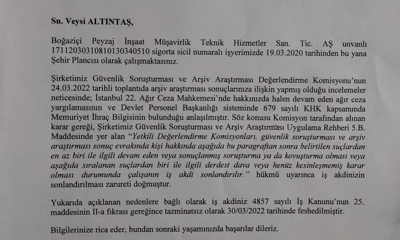 Veysi Altıntaş, "İBB haksız ve hukuksuz bir şekilde iş akdimi feshetti. İşten çıkarılma gerekçesinde barış bildirisini imzalamaktan dolayı KHK ile ihraç edilmiş olmam ve hakkımda devam eden bir ağır ceza davası kanıt olarak gösterilmiş. Ama mevzu bunların çok ötesinde" dedi.