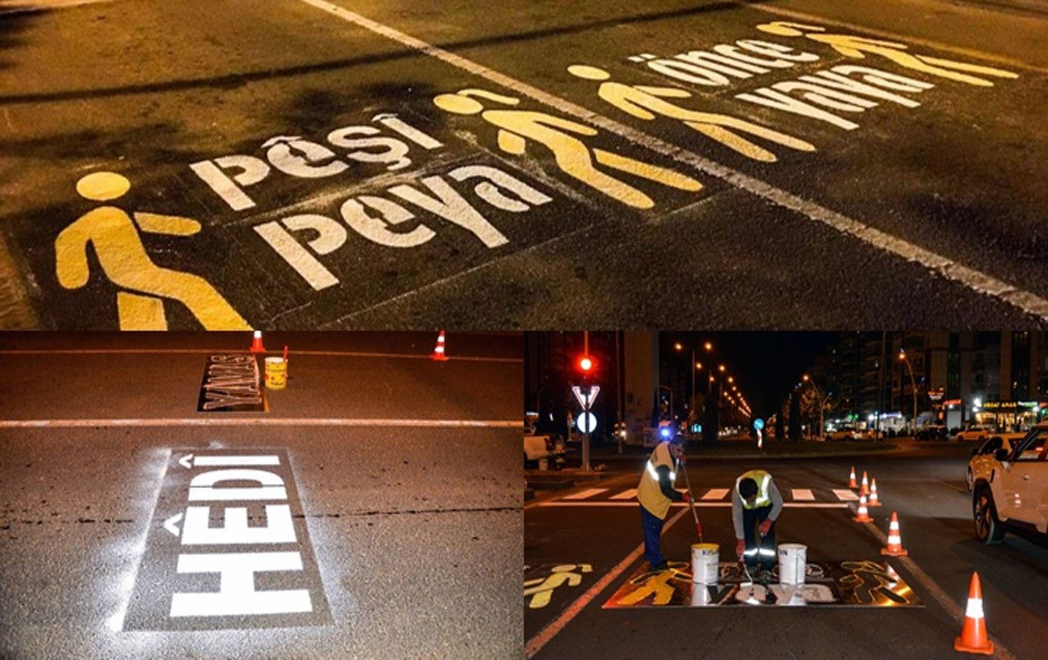 Çalışma kapsamında; Elazığ Caddesi Çamlıca Kavşağı ve Bağlar ilçesi Aram Tigran Kavşağı’na yaya geçidi çizgisi ile Türkçe'nin yanında Kürtçe olarak yazılan “pêşî peya/önce yaya” ikonları ile “hêdî/yavaş” sembolleri yenilendi.