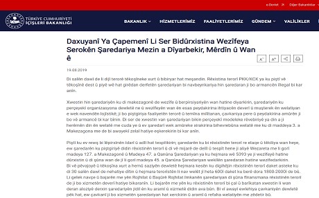 Haber Merkezi- Türkiye İçişleri Bakanlığı,Diyarbakır, Mardin ve Van’a kayyum atamasının ardından, yayımladığı açıklamayı Kürtçe olarak da yaptı.
