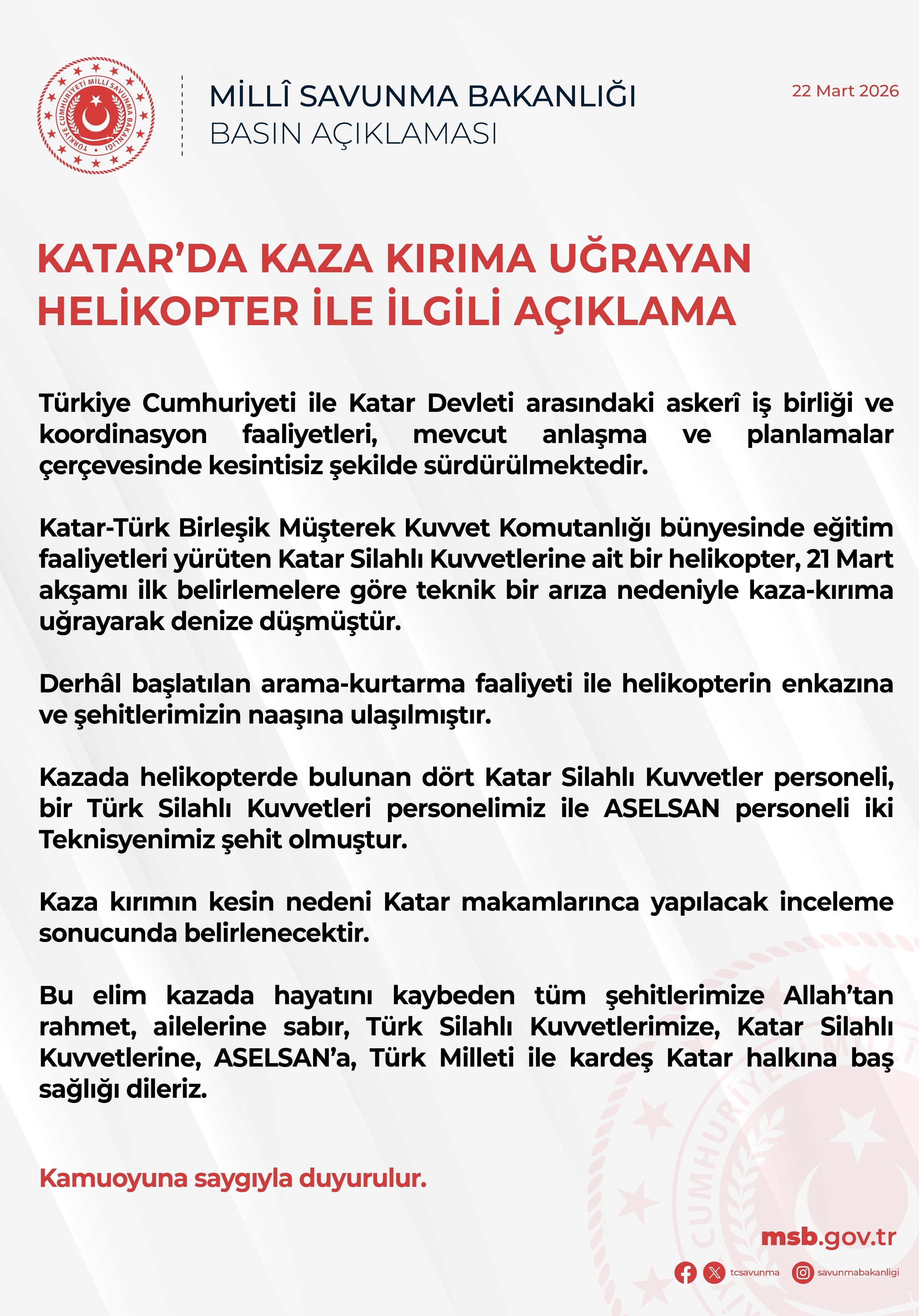 "Bu elim kazada hayatını kaybeden tüm şehitlerimize Allah’tan rahmet, ailelerine sabır, Türk Silahlı Kuvvetlerimize, Katar Silahlı Kuvvetlerine, ASELSAN’a, Türk Milleti ile kardeş Katar halkına baş sağlığı dileriz. Kamuoyuna saygıyla duyurulur."