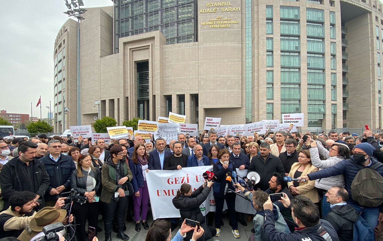 CHP ve HDP milletvekillerinin de destek verdiği açıklamada "Gezi umuttur, umut yargılanamaz" yazılı pankart açıldı.