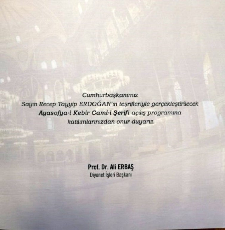 Diyanet İşleri Başkanı Prof. Dr. Ali Erbaş imzasıyla gönderilen davetiyede, “Cumhurbaşkanımız Sayın Recep Tayyip Erdoğan’ın teşrifleriyle gerçekleştirilecek Ayasofya-i Kebir Cami-i Şerifi açılış programına katılımlarınızdan onur duyarız” ifadeleri kullanıldı.