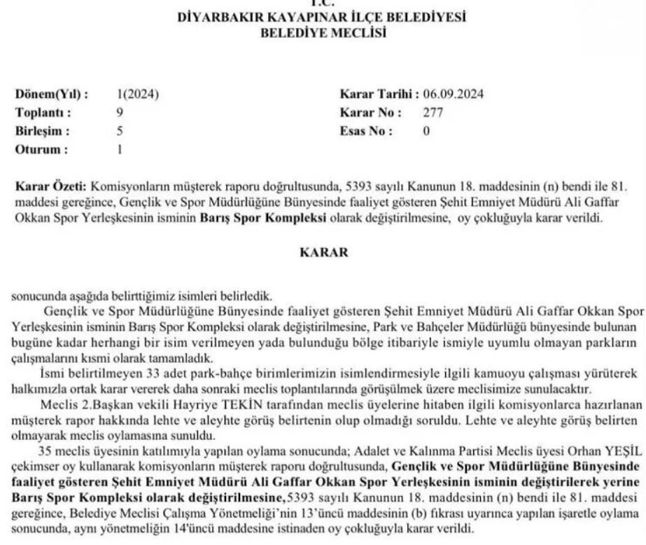 Haber Merkezi – Diyarbakır'da Kayapınar Belediye Meclisi'nin kararıyla “Şehit Emniyet Müdürü Ali Gaffar Okan Spor Yerleşkesi”nin adı “Barış Spor Kompleksi” olarak değiştirildi.