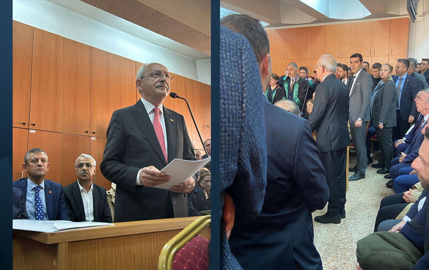 Kılıçdaroğlu, duruşmanın görüleceği Ankara Adliyesi önünde kalabalık bir grup tarafından 'Hak hukuk adalet' sloganları ile karşıladı. CHP lideri Özgür Özel ve Ankara Büyükşehir Belediye Başkanı Mansur Yavaş da adliyeye geldi.