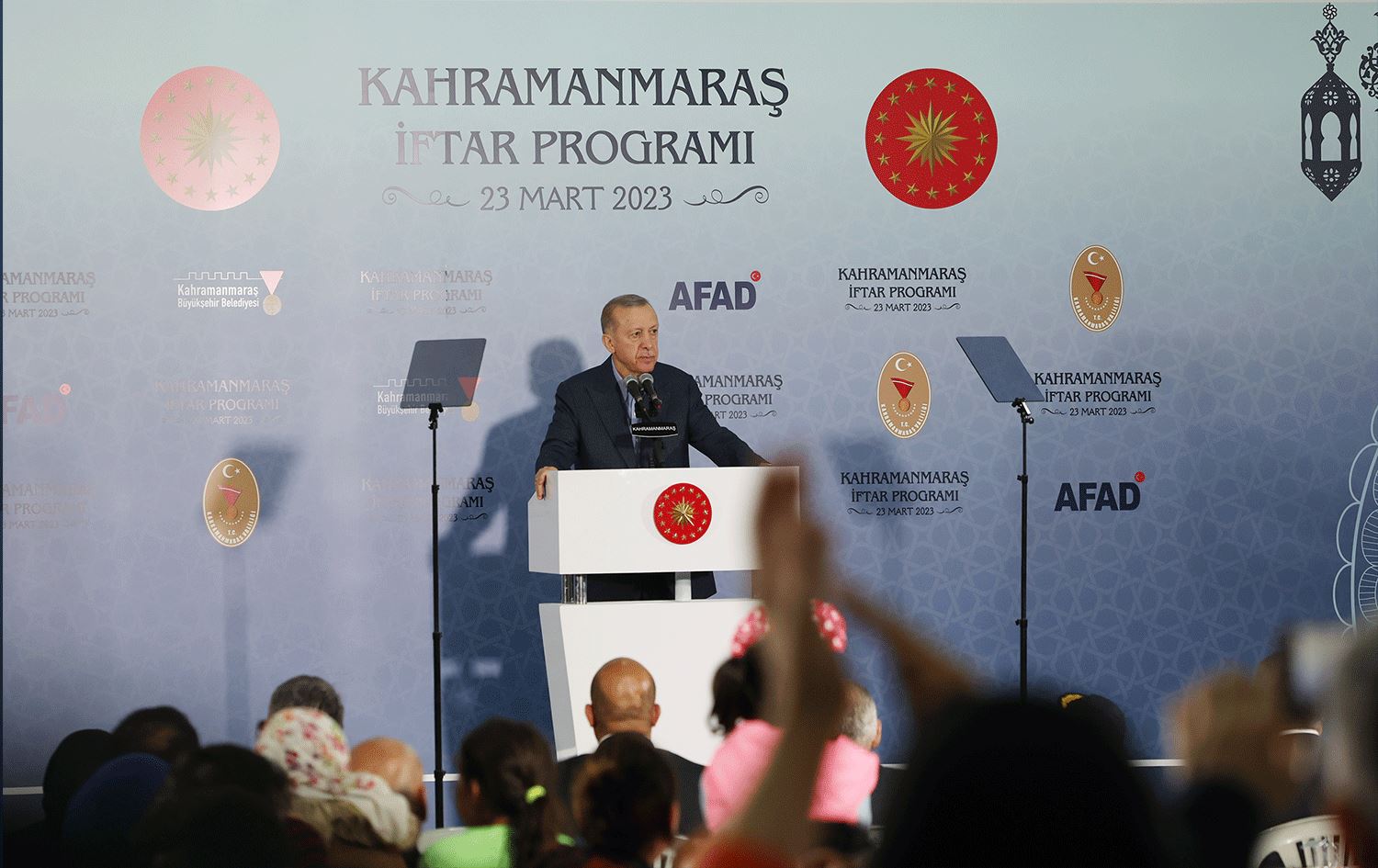 Cumhurbaşkanı Erdoğan, Maraş Belediyesi önünde düzenlenen "Pazarcık Depremi Sonrası 17 Bin 902 Afet ve Köy Konutu İlk Temel Atma Töreni"nde konuştu.