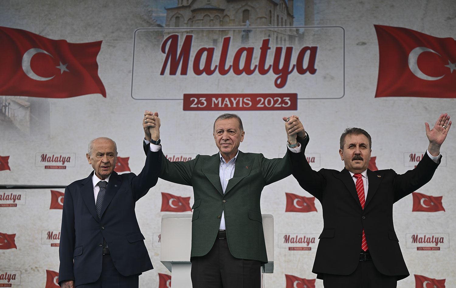 Türkiye Cumhurbaşkanı Erdoğan, beraberinde MHP Genel Başkanı Devlet Bahçeli (solda) ve BBP Genel Başkanı Mustafa Destici (sağda) ile mitinge katılanları selamladı. / AA