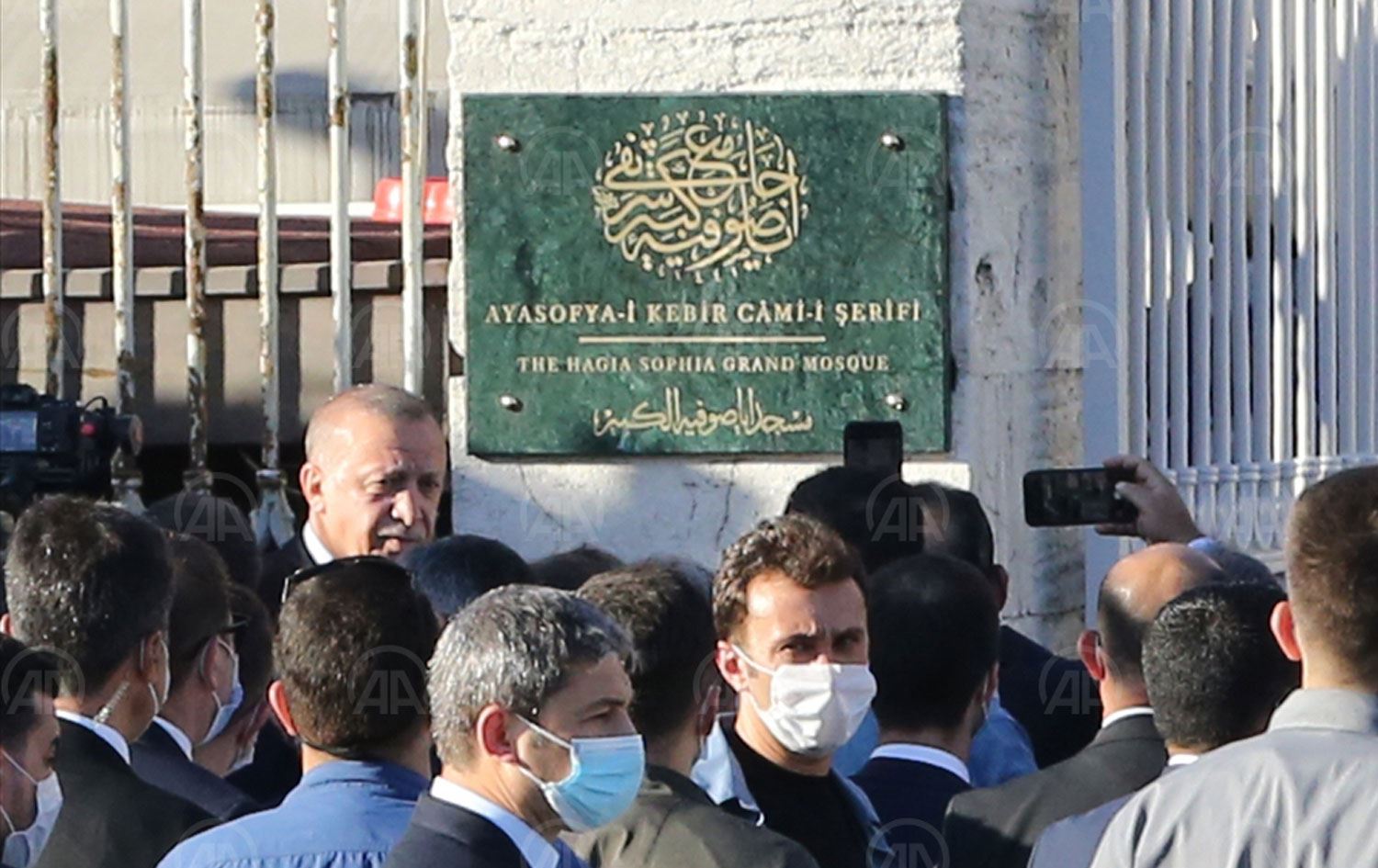 Erdoğan ve beraberindekiler Ayasofya Camisi'nin girişine gelerek "Ayasofya-i Kebir Cami-i Şerifi" yazan tabelayı açtı, tabela önünde fotoğraf çektirdi.