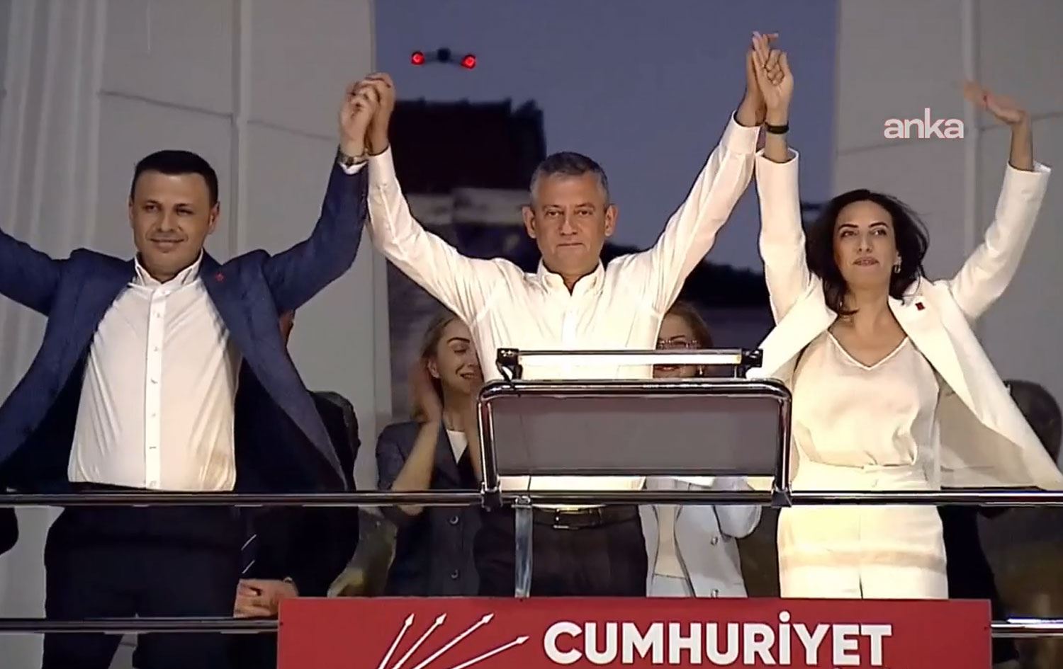 Mitingde konuşan Özgür Özel, Evrim Rızvanoğlu ve Cem Avşar’ı sahneye davet ederek CHP rozetlerini taktı.