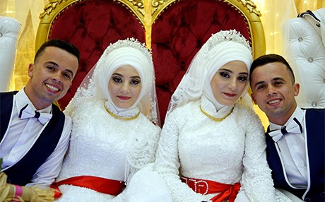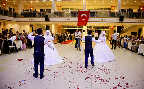 Aynı düğün salonunda çifte düğün merasimi gerçekleştiren erkek kardeşler aynı renk damatlığı kız kardeşler de aynı model gelinliği giydi.