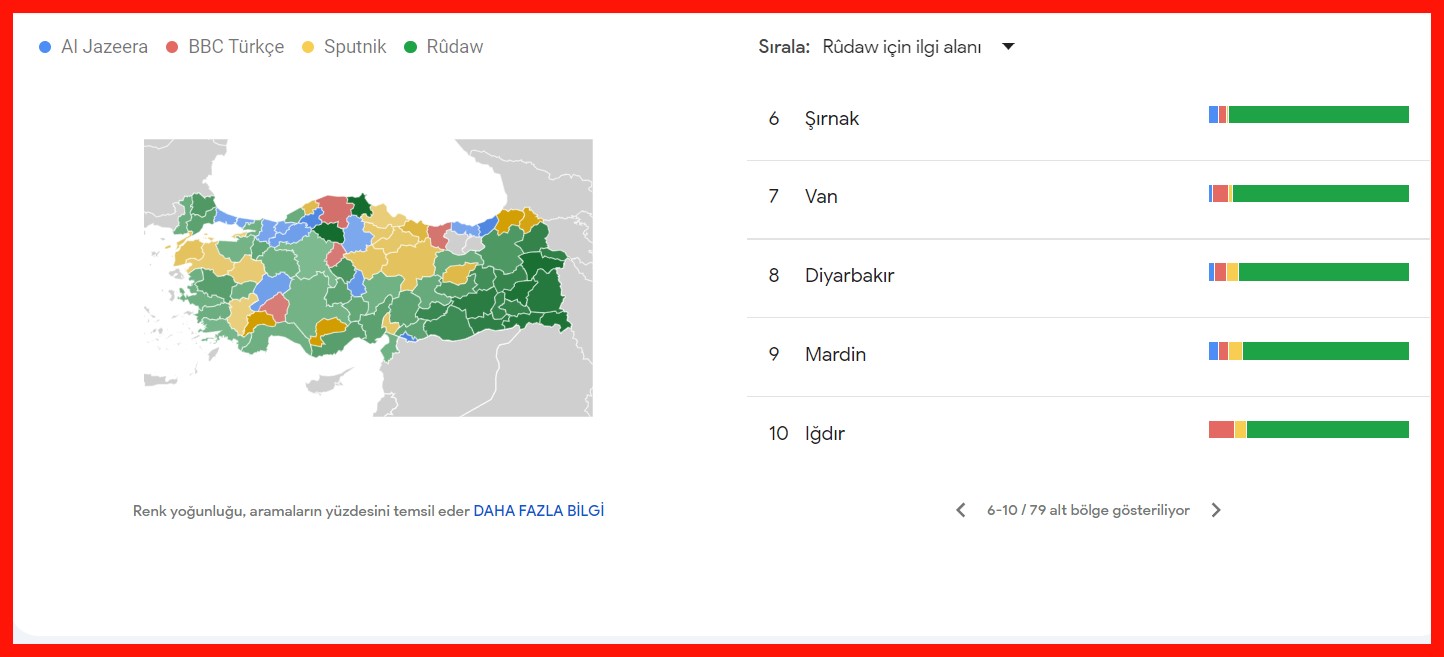 İlgili haberde “Çoğu ilde dört yayın kuruluşu içinde en çok Rûdaw aranmış. İç Ege ve Orta Karadeniz gibi bazı bölgelerde Sputnik önde. Al Jazeera İstanbul ve Doğu Karadeniz’de, BBC ise sadece Kastamonu, Giresun, Aksaray ve Isparta’da ilk sırada” bulgusuna yer verildi.