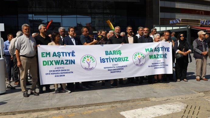 Haber Merkezi - DEM Parti Diyarbakır İl Örgütü, eş başkanların, seçiliş siyasetçilerin ve demokratik kurumların katılımıyla Diyarbakır'da imza standı kurarak “Barış İstiyoruz” kampanyasını başlattı. Açıklamada, "savaş siyasetinin" toplumu çöküşe sürüklediği vurgulanarak "barış ve özgürlükçü yaşam" çağrısı yapıldı.