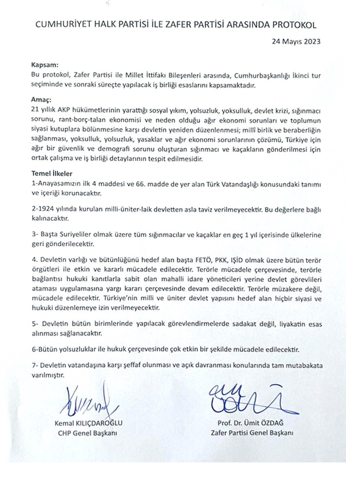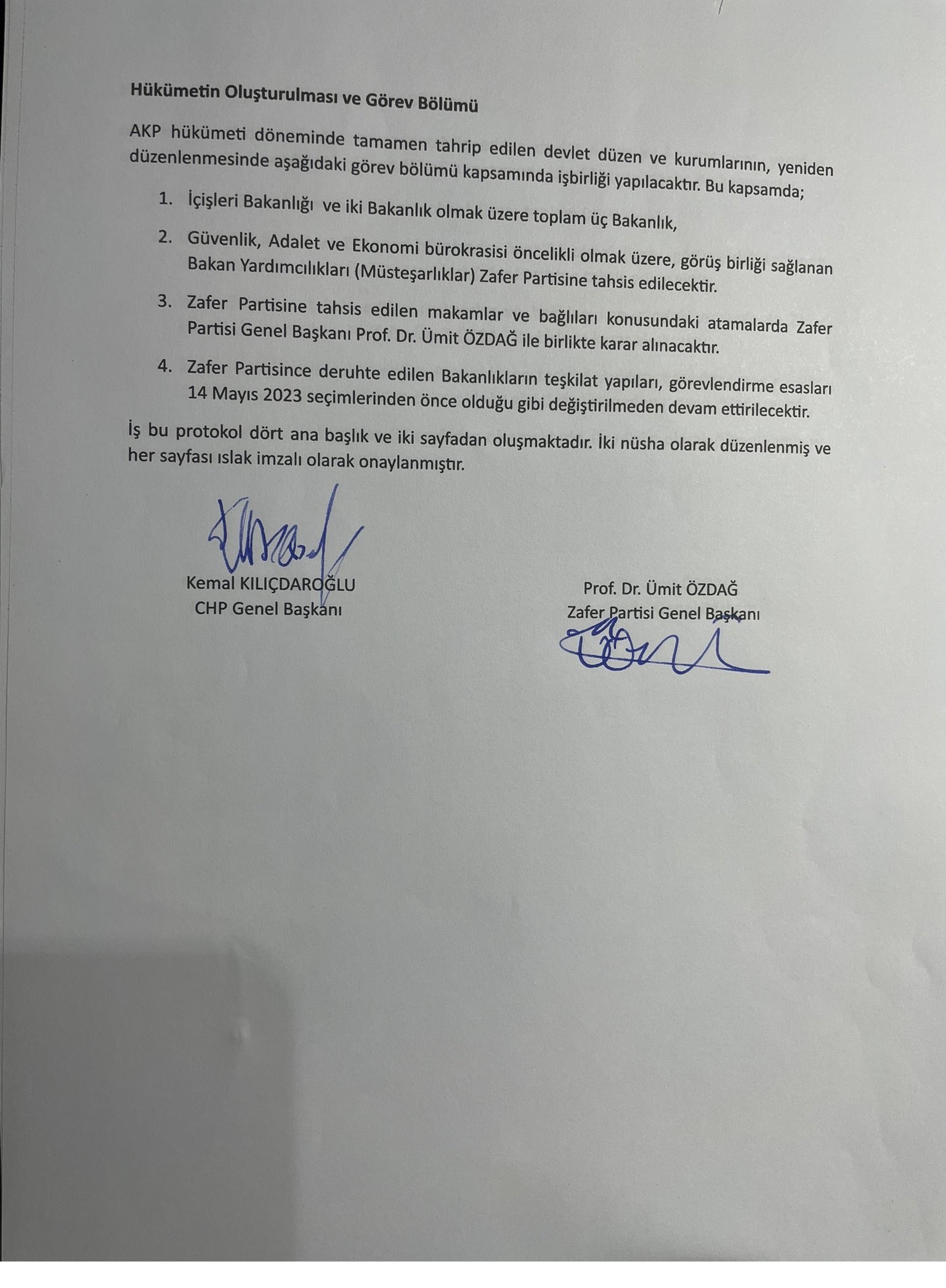 Haber Merkezi - Zafer Partisi Genel Başkanı Ümit Özdağ, eski CHP Genel Başkanı Kemal Kılıçdaroğlu ile yaptıkları gizli protokolün metnini sosyal medya hesabından paylaştı.