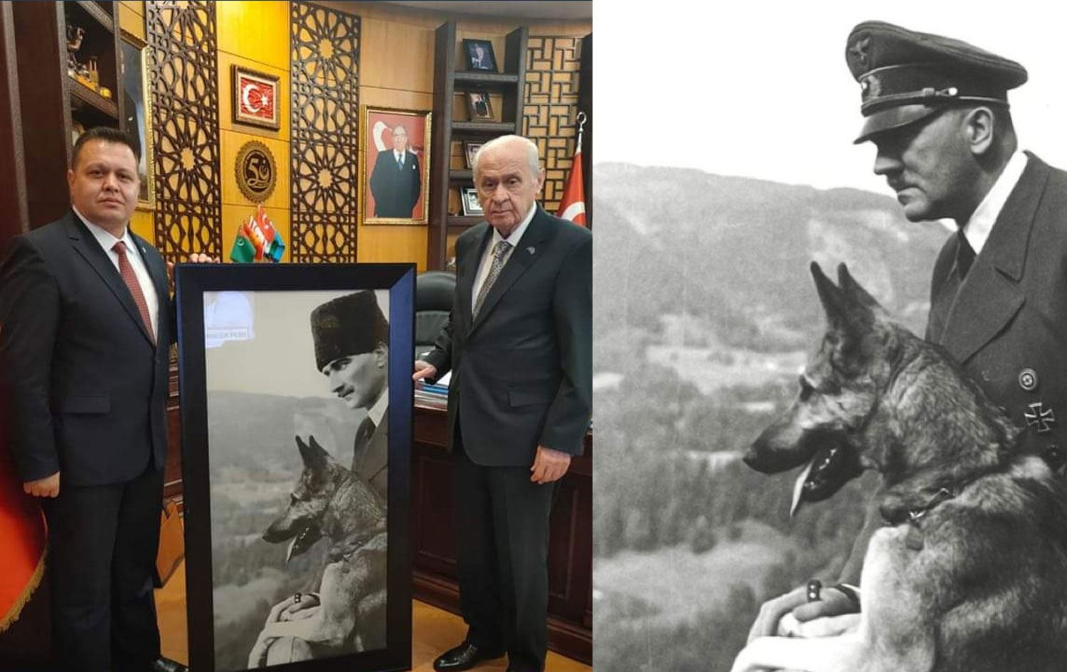 Haber Merkezi – MHP Genel Merkezi tarafından geçtiğimiz gün MHP İl başkanlığı görevine atanan Cüneyt Tosuner, partisinin Genel Başkanı Devlet Bahçeli’ye ziyaretinde hediye ettiği Atatürk’ün kurt ile birlikte çekilmiş fotoğrafın aslının Nazi Almanyası‘nın lideri Adolf Hitler’e ait olduğu ortaya çıktı.