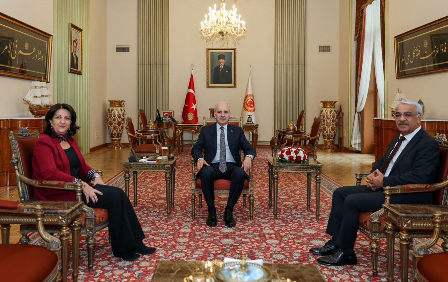 Halkların Eşitlik ve Demokrasi Partisi (DEM Parti) İmralı Heyeti üyeleri Pervin Buldan ve Mithat Sancar, Meclis Başkanı Numan Kurtulmuş ile yaptığı görüşme sona erdi.