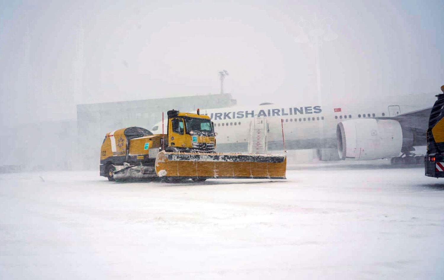 Kar yağışı nedeniyle tüm seferlerin saat 18.00'e kadar durdurulduğu İstanbul Havalimanı'nda pist ve taksi yollarını temizleme çalışmaları sürüyor.