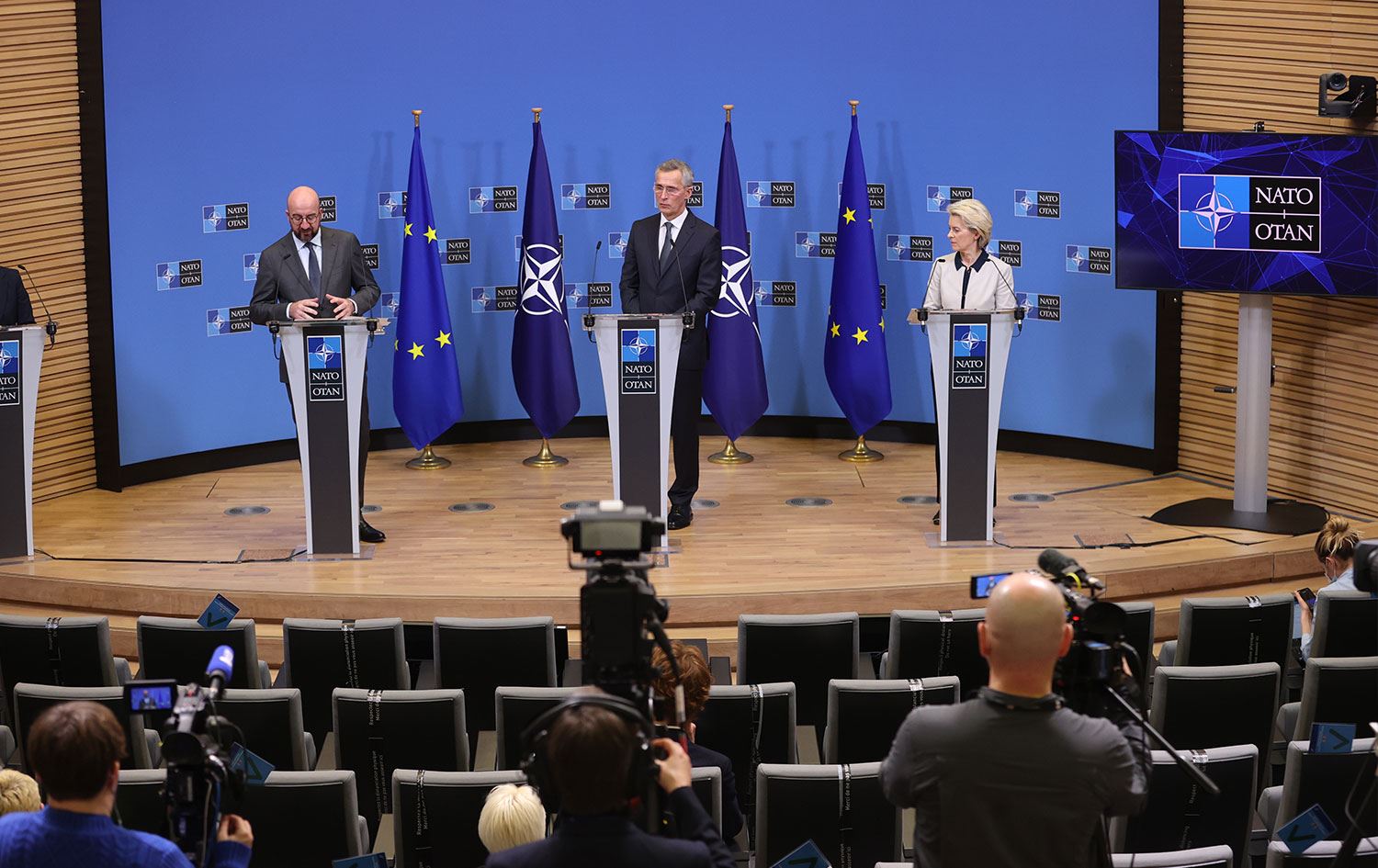 NATO Genel Sekreteri Jens Stoltenberg, AB Komisyonu Başkanı Ursula von der Leyen, AB Konseyi Başkanı Charles Michel ile Brüksel'deki NATO karargahında bir araya geldi. AA