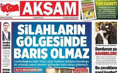 Akşam gazetesi, Cumhurbaşkanı Erdoğan’ın sözlerini “Silahların gölgesinde barış olmaz” başlığıyla manşetine taşıdı. Açıklamaların “süreç çıkışı” olarak değerlendirildiği haberde Erdoğan’ın şu sözleri yer aldı: