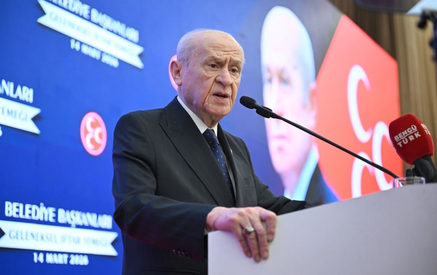 "Uluslararası insancıl hukuk paçavraya dönmüştür" diyen MHP Genel Başkanı Bahçeli, "Çünkü ne dikkate alan, ne saygı duyan, ne de riayet ve itibar eden kalmıştır. Bilhassa uluslararası barış ve güvenliği korumak, insan haklarını geliştirmek, sürdürülebilir kalkınmayı temin etmek maksadıyla 24 Ekim 1945 yılında kurulan Birleşmiş Milletler Teşkilatı tarihin en aciz ve perişan dönemine hapsolmuştur. Fiilen hukuksal işlevini ve bağlayıcılığı iradesini kaybetmiştir. Amerika Birleşik Devletleri ile İsrail'in eş güdüm halinde İran'a karşı icra ettikleri orantısız, haksız ve gerekçesiz saldırıların 25. gününde komşu coğrafyalar toz duman içindedir. Trump'ın İran'ı yok edeceğiz tehdidi, İran Dışişleri Bakanı'nın Amerikalılara müzakereler sonsuza dek sona ermiştir açıklaması, İsrail Başbakanı'nın şiddet dozajının artacağını söyleyerek savaşın ne kadar gerekirse o kadar süreceğini ifade etmesi barış ümitlerini sekteye uğratmaktadır" şeklinde konuştu.