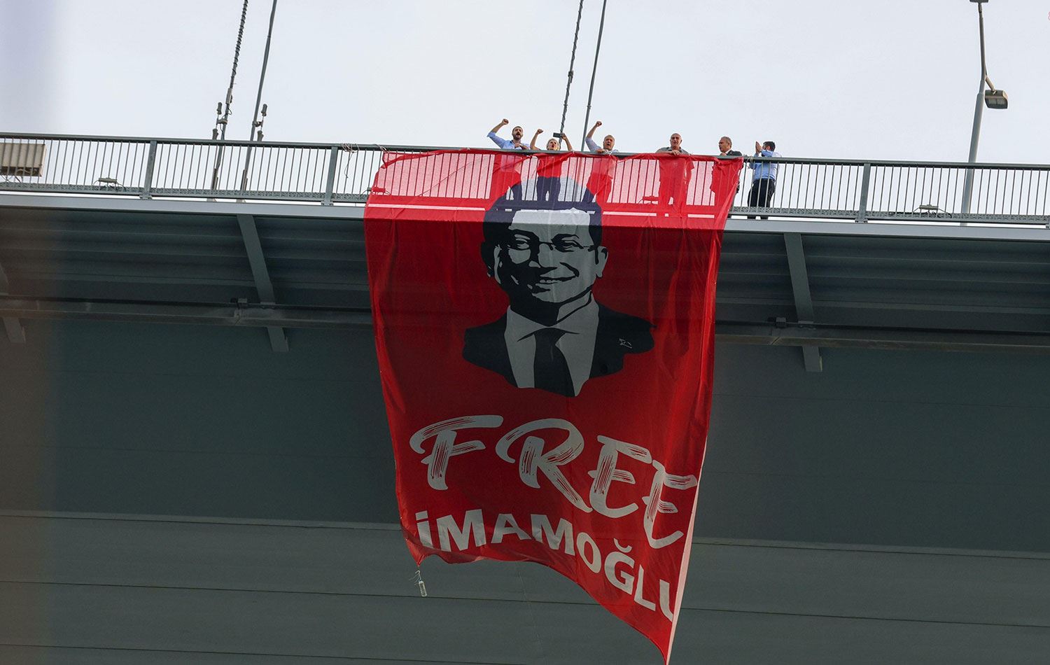 CHP Genel Başkan Yardımcısı Özçağdaş, Şanlıurfa Milletvekili Mahmut Tanal, İstanbul Milletvekilleri Nimet Özdemir ve Ali Gökçek, Tekirdağ Milletvekili İlhami Özcan Aygun ile Edirne Milletvekili Ahmet Baran Yazgan, akşam saatlerinde, tutuklanarak İstanbul Büyükşehir Belediye Başkanlığı görevinden uzaklaştırılan Ekrem İmamoğlu'nun silüeti bulunan "Free İmamoğlu" yazılı pankartı köprüye astı.