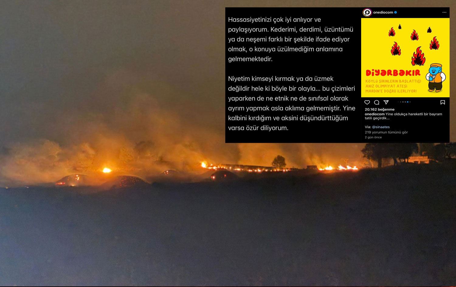 Haber Merkezi – 15 kişinin yaşamını yitirdiği Diyarbakır –Mardin’deki yangın felaketini 'Köylü Şirinlerin başlattığı anız olimpiyat ateşi Mardin'e doğru ilerliyor!' şeklinde tiye alan Onedio editörü gelen tepkiler üzerine özür diledi, içeriği kaldırdı.