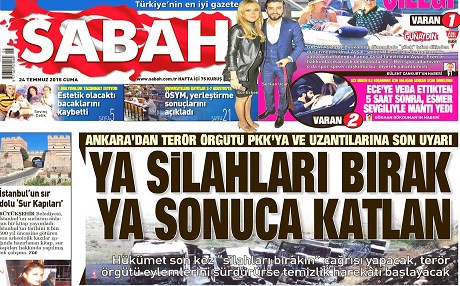 Sabah gazetesi de, çözüm süreci kapsamında Türkiye’nin PKK’yi son kez uyardığını yazdı. Gazetenin, “Ya silahları bırak ya sonuca katlan” başlığıyla duyurduğu haberde şu ifadeler yer aldı: